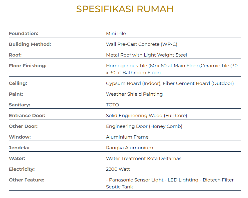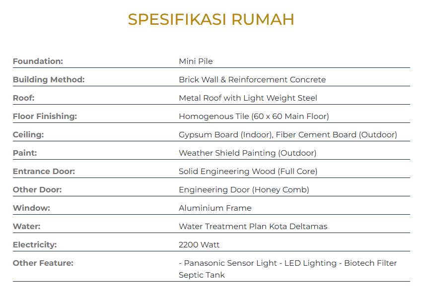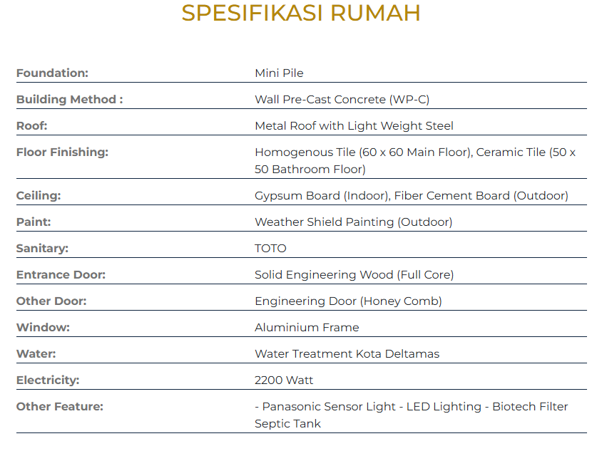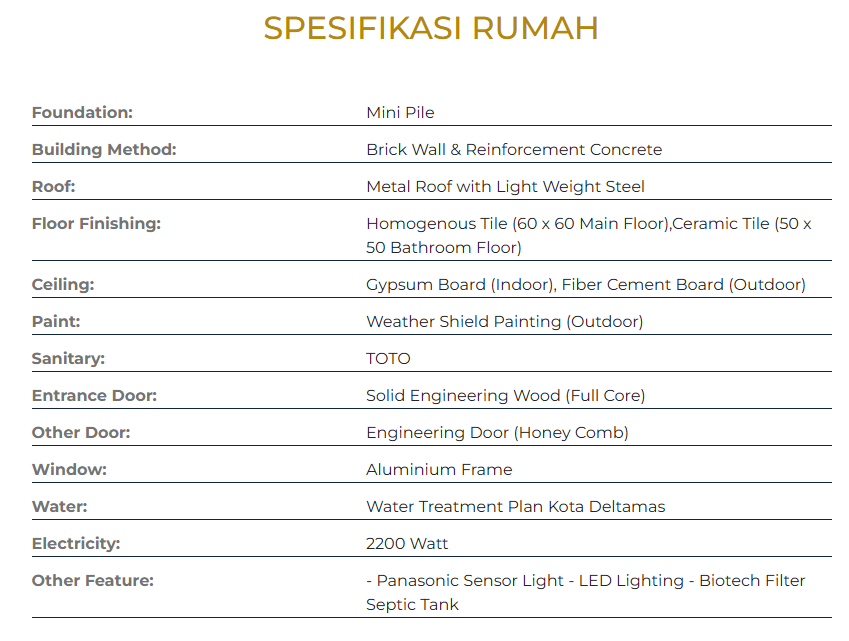 - Sanitary: Kohler/equivalent, dengan suplai air dari Kota Deltamas.